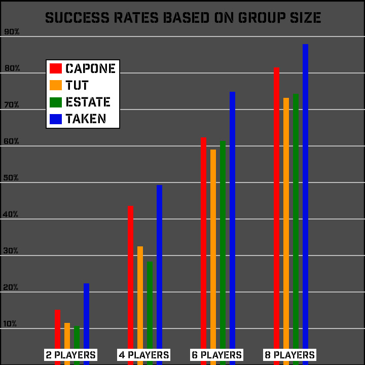 GROUP SIZE: Group size is huge when determining whether or not you will be successful (see chart). Escape rooms are definitely geared toward larger groups as they are designed for 6-8 players. So if your current group is on the small side, grab some friends or recruit some family members for the best possible chance at escaping.